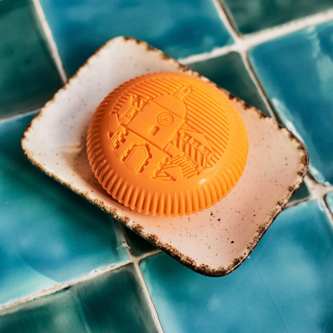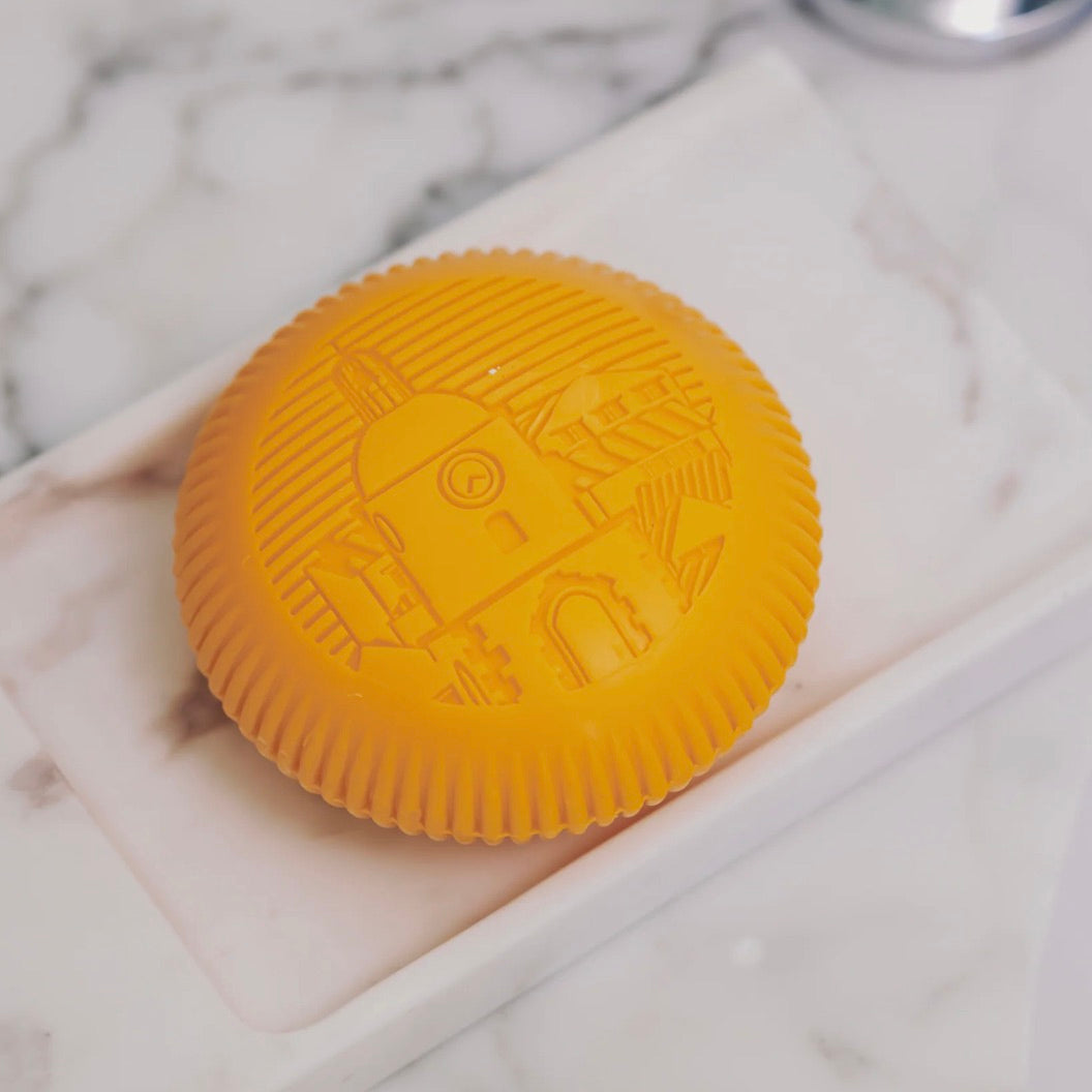 En orange clair, la savon Baobab Collection À Saint-Tropez est en relief d'éléments stylisés représentant le village emblématique. Sa formule à base d'huile de baobab est douce et hydratante pour la peau, tandis que son parfum aromatique de thym, de basilic et de menthe laisse une sensation extrêmement fraîche.