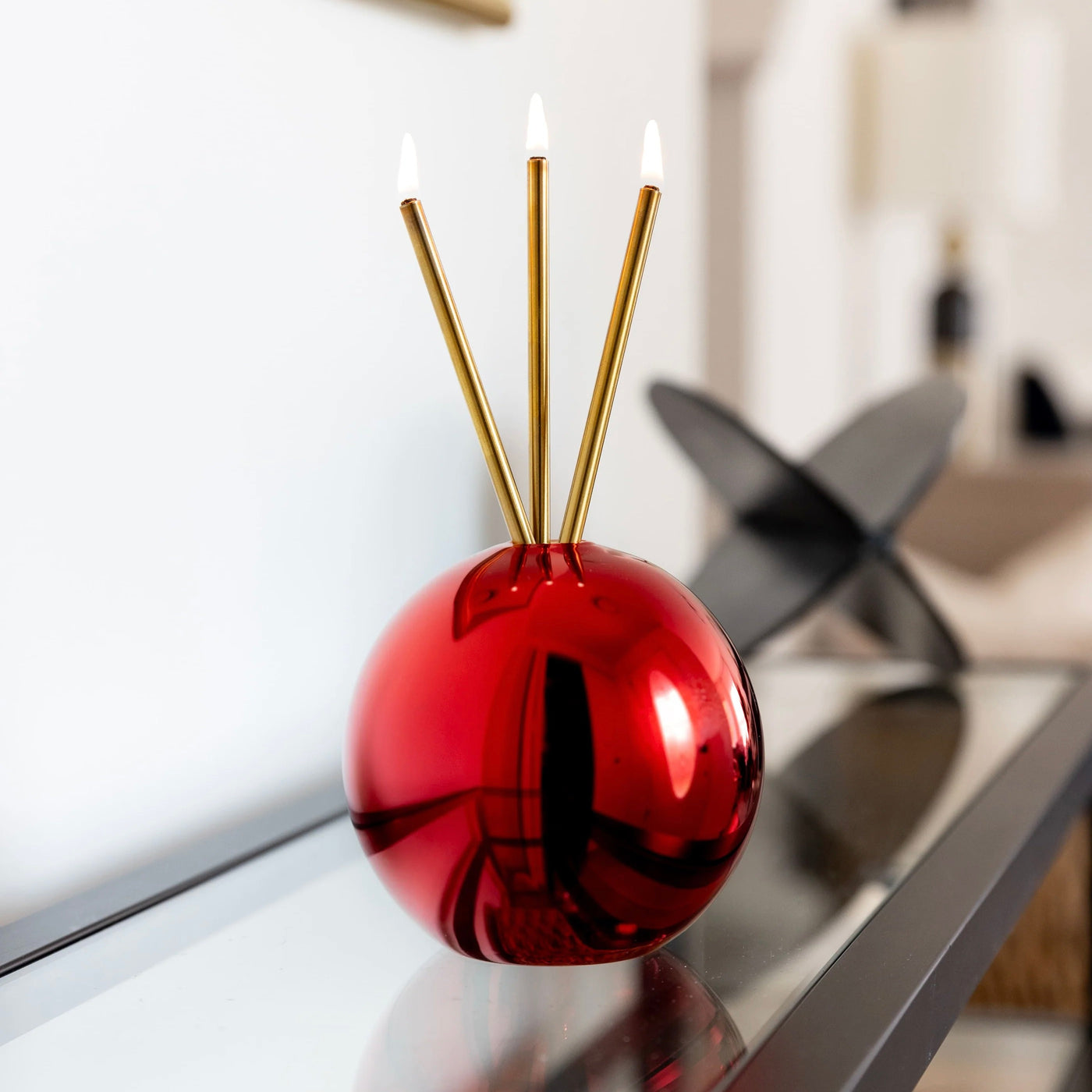 Le rouge métallisé, vibrant et sophistiqué, capte les reflets du jour comme ceux du soir — une touche d’audace au cœur du décor.